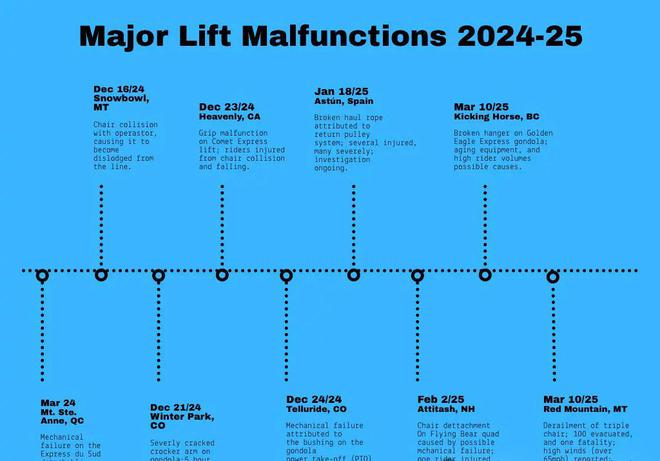 2024-25滑雪季的统计数据尚不完整,因为北美滑雪季仍在进行中。行业会议通常在4月底至5月底举行,届时数据才会公开。尽管如此,今冬缆车机械故障事故似有增加趋势,成为行业内讨论的焦点。虽然部分事故导致了严重伤害,但更多情况是大规模疏散,滑雪者和雪板爱好者被悬在半空数小时后获救。