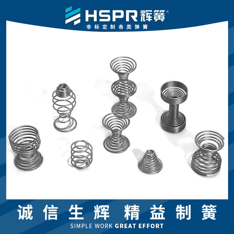 中凹形螺旋弹簧是上下圆盘直径大,中部直径小的弹簧。大量用于床垫和沙发制作。宝塔弹簧呈圆锥形,常用钢丝卷帘轧成弹性垫子,适用于汽车和沙发坐垫。